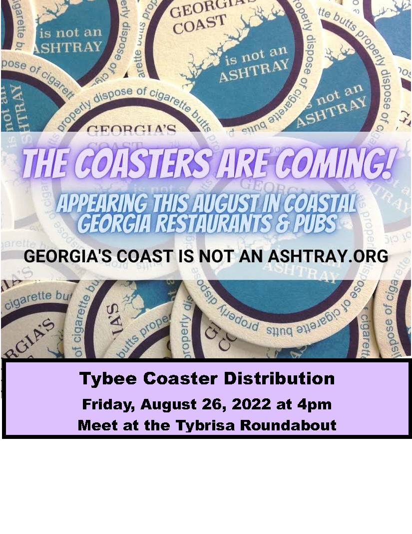To celebrate the Georgia’s Coast is NOT an Ashtray Campaign, a Community-wide Cleanup will be held at Memorial Park, 402 Jones Ave., Tybee Island on Saturday, August 27 from 9:30 - 11:30 AM. Come pick up a grabber and bucket and clean your neighborhood. Return your trash and receive a Georgia’s Coast is NOT an Ashcan T-shirt. In addition, coasters will be distributed to all Tybee bars and restaurants Friday, August 26 at 4pm. Meet at the roundabout (Tybrisa St. and Strand Ave.) to help distribute the 6,000 coasters.